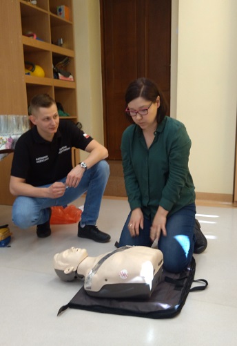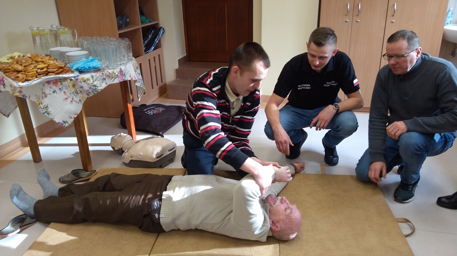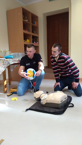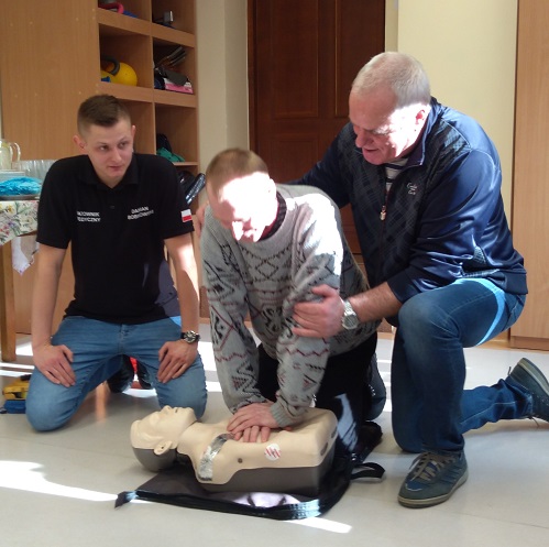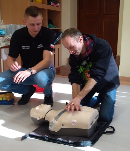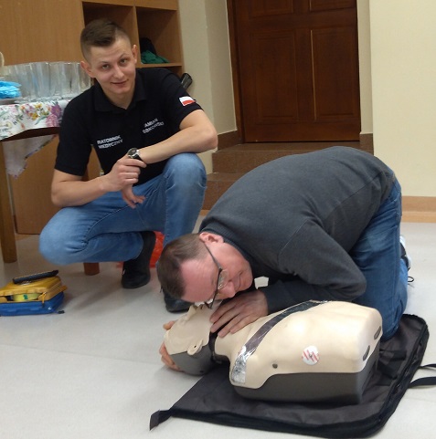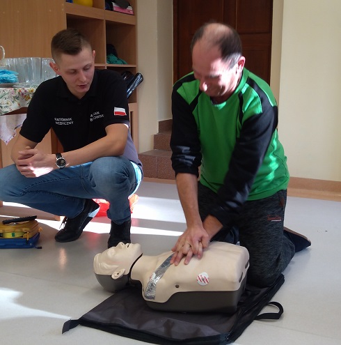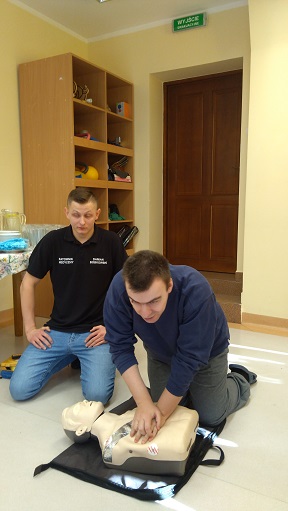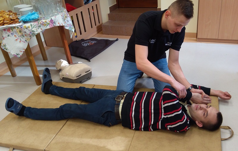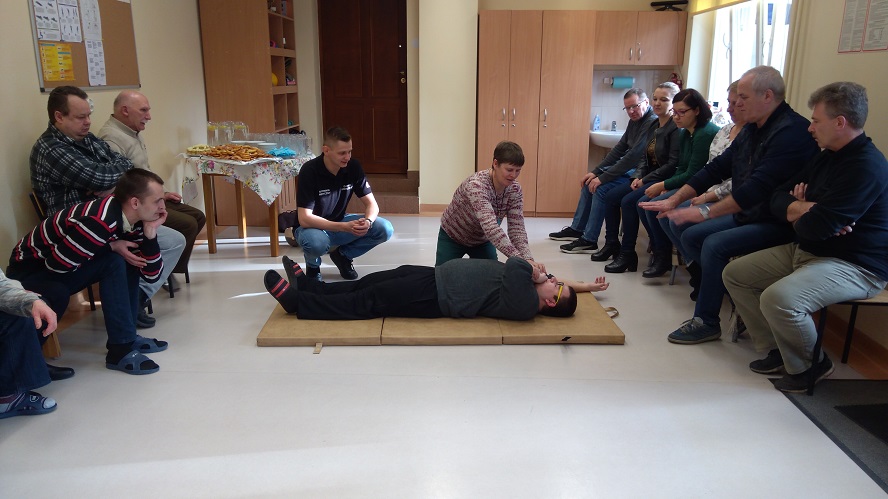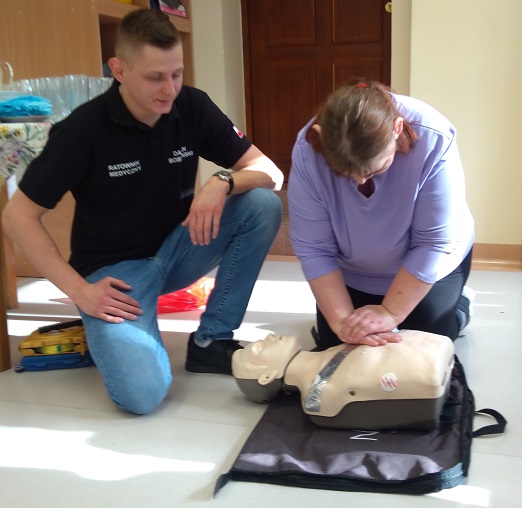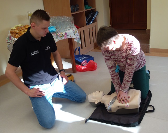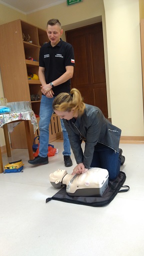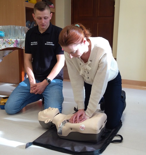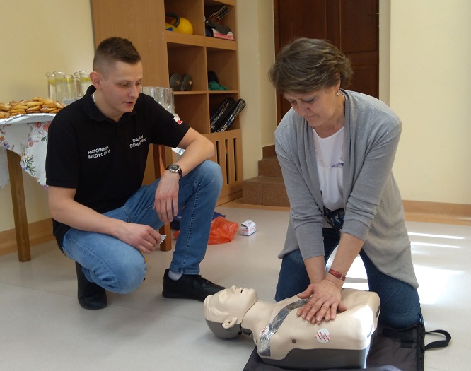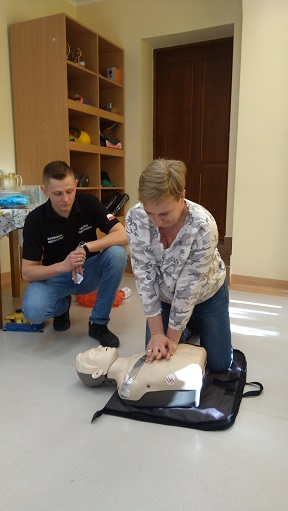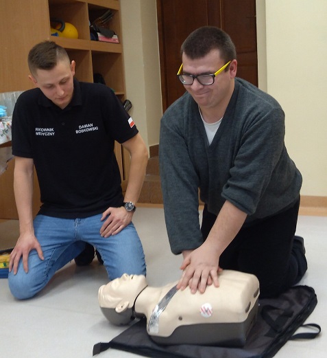 Udzielanie pierwszej pomocy jest czynnikiem kluczowym podczas zdarzeń nagłych zagrażających życiu lub zdrowiu. Głównym celem zajęć było przećwiczenie praktycznych zasad udzielenia pierwszej pomocy, jak wzywanie pomocy, sprawdzenie przytomności osoby poszkodowanej, pozycja boczna ustalona, wykonywanie oddechów ratowniczych, czy uciskanie klatki piersiowej, które ćwiczyliśmy na fantomie. Uczestnicy okazywali duże zainteresowanie oraz chętnie angażowali się w ćwiczenia praktyczne.