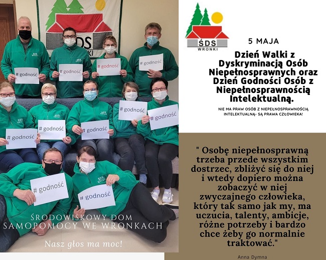 5 maja- dziś obchodzimy Dzień Walki z Dyskryminacją Osób Niepełnosprawnych oraz Dzień Godności Osób z Niepełnosprawnością Intelektualną. W tym dniu chcemy pokazać solidarność z osobami z niepełnosprawnością intelektualną. Zapraszamy do włączenia się i wyrażenia solidarności z ideą Dnia Godności poprzez zrobienie swojego zdjęcia wraz z hasłem #godność. Chcemy poprzez promocję hasła okazać wsparcie i promować postawę niedyskryminacji i godności wobec osób z niepełnosprawnością intelektualną. Chcemy zaznaczyć, że wszystkie osoby z niepełnosprawnością intelektualną i ich rodziny mogą stanowić integralną całość ze społeczeństwem, niezależnie od rozmaitych ograniczeń wynikających ze stanu zdrowia czy niepełnosprawności. ,, Osobę niepełnosprawną trzeba przede wszystkim dostrzec, zbliżyć się do niej i wtedy dopiero można zobaczyć w niej zwyczajnego człowieka, który tak samo jak my, ma uczucia, talenty, ambicje, różne potrzeby i bardzo chce żeby go normalnie traktować”/ Cytat: Anna Dymna NIE MA PRAW OSÓB Z NIEPEŁNOSPRAWNOŚCIĄ INTELEKTUALNĄ- SĄ PRAWA CZŁOWIEKA. Czujemy ogromną radość by chociaż symbolicznie móc być w tym dniu razem z Wami i obchodzić ten dzień. Jeśli masz ochotę włączyć się do akcji, okazać wsparcie osobom z niepełnosprawnością intelektualną wystarczy zrobić zdjęcie sobie, rodzinie, znajomym z napisem #godność i opublikować na portalu społecznościowym. Razem Nasz głos ma moc! # godność # niepełnosprawność